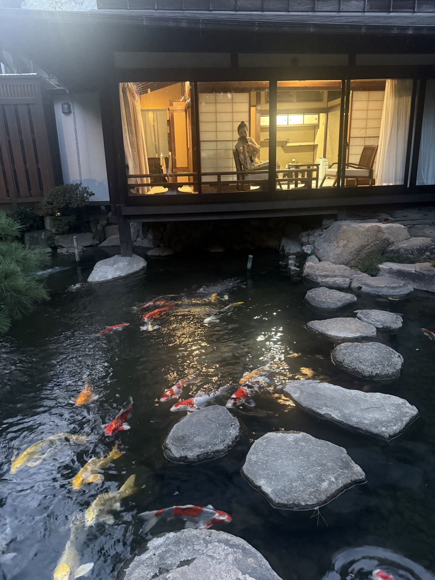 縁側に座ると、手入れの行き届いた名園が独り占めでき、優雅に泳ぐ鯉の姿に時間が経つのを忘れてしまいます。さらに、お部屋には専用の露天風呂も完備されており、好きな時に好きなだけ、自分たちだけの湯浴みを楽しめるという、まさに夢のようなひとときでした。